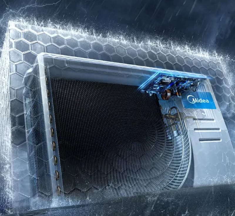 Midea Prime Guard technologija saugo išorinį bloką nuo korozijos, druskų ir nepalankių oro sąlygų, prailgina įrenginio tarnavimo laiką ir padeda palaikyti švaresnę aplinką, stabdydama bakterijų plitimą. Be to, ši technologija sutrumpina išorinio bloko atitirpinimo laiką ir padidina energinį efektyvumą.