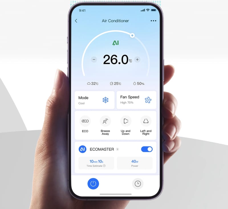 Dirbtiniu intelektu paremtas AI EcoMaster algoritmas, iš anksto apmokytas naudojant milijardus duomenų taškų, užtikrina efektyvų energijos valdymą net ir be interneto ryšio. Ši sistema tiksliai palaiko nustatytą temperatūrą, iš anksto prognozuoja veikimo poreikius ir padeda sutaupyti iki 30 % daugiau energijos.