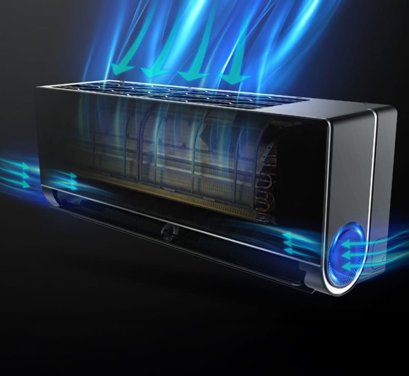 Šoniniai oro įsiurbimo tarpai padidina oro paėmimo plotą ir sumažina pasipriešinimą. Tai leidžia įrenginiui lengviau ir efektyviau cirkuliuoti orą, užtikrinant tolygesnį temperatūros pasiskirstymą visoje patalpoje.