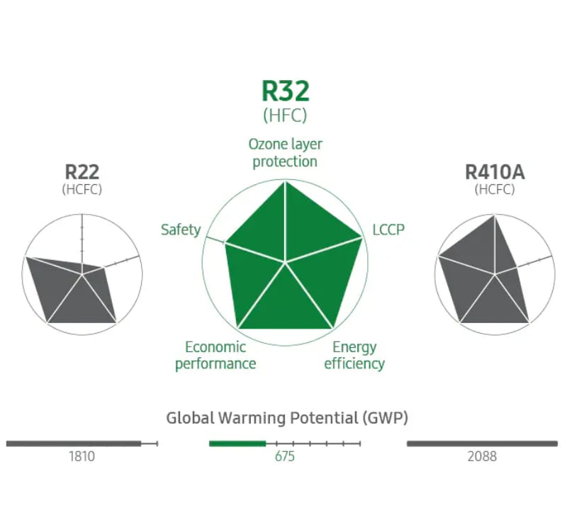 Oro kondicionieriuje cirkuliuoja naujos kartos R32 šaltnešis, kuris padeda apsaugoti ozono sluoksnį ir, palyginti su įprastais R22 ar R410A šaltnešiais, daro labai nedidelį neigiamą poveikį visuotinėms atšilimo tendencijoms.