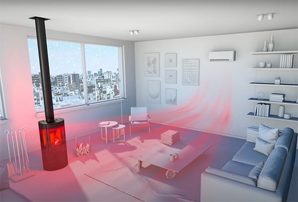 Nieko nėra jaukiau už židinį namuose, tiesa? Savaime suprantama, kad židinys taip pat skleidžia šilumą. O tai „Daikin“ šildymo įranga įvertina židinio logikos funkcija. Kambariai su židiniu paprastai būna šiltesni. Vos kambariui įšilus iki norimos temperatūros dėl antrinio šilumos šaltinio, automatiškai įsijungia židinio logikos funkcija. Nors vidinis įrenginys nustoja šildyti, ventiliatorius nuolat sukasi, kad šiluma būtų paskirstoma visame kambaryje.