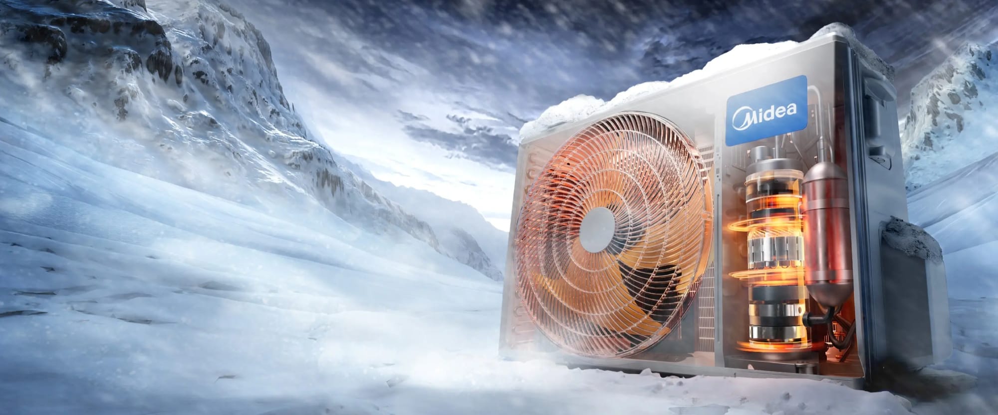 Midea inverterinė technologija garantuoja reikiamą šilumos galią net ir šalčiausiomis žiemos sąlygomis, kai lauko temperatūra gali siekti ir -35℃. Esant žemai lauko oro temperatūrai didinamos kompresoriaus ir ventiliatoriaus apsukos, taip užtikrinama reikiama šiluminė galia.
