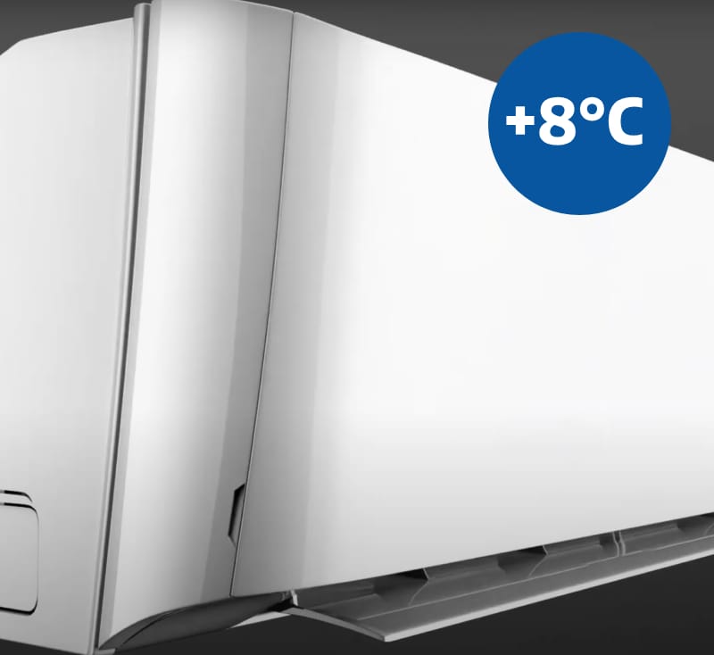 Šildymo režimu siurblys palaiko +8 °C temperatūrą, kai patalpa laikinai nenaudojama. Tai puikus pasirinkimas ilgalaikių išvykų metu, kai norite apsaugoti erdvę nuo per didelio atvėsimo, tuo pačiu taupant energiją.