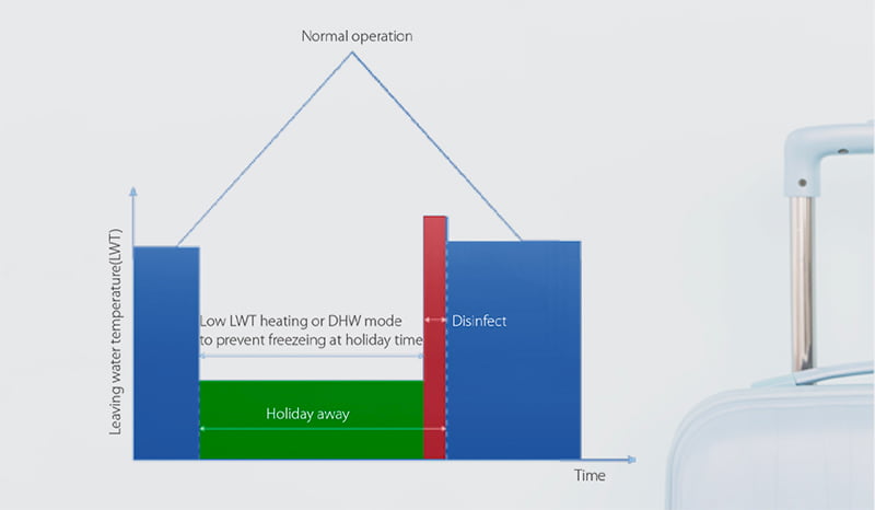 Atostogų funkcija – sistemos darbo resurso ir energijos taupymo režimas. Įrenginys veikia šildymo režimu ir (arba) karšto vandens ruošimo režimu palaikydamas minimalią vandens temperatūrą, reikiamą, kad žiemos metu sistema neužšaltų. Prieš grįžtant namo vartotojas gali iš anksto nustatyti dezinfekcijos režimą ir būti tikras, kad grįžus namo naudos švarų bakterijomis neužterštą vandenį.